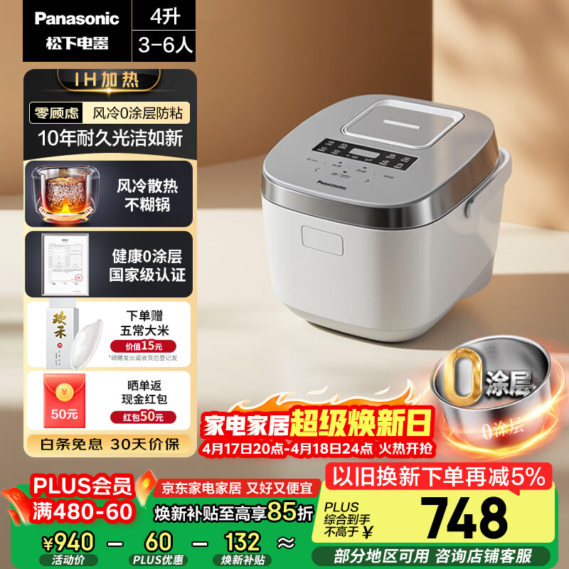 自营松下(Panasonic)Xtra零零煲电饭煲0涂层IH家用无涂层电饭锅4-5人不锈钢胆4升一级能效SR-HFS153C-W