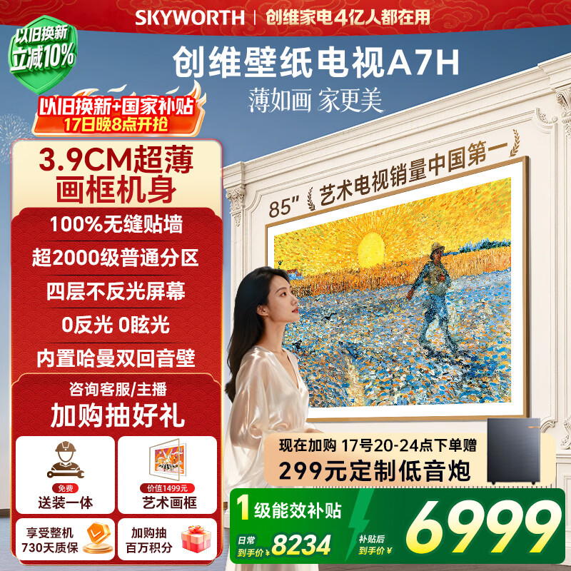 自营创维电视85A7H 85英寸【送装一体-固定挂架】艺术壁纸电视Mini LED3.9cm超薄平板电视机 家电国家补贴