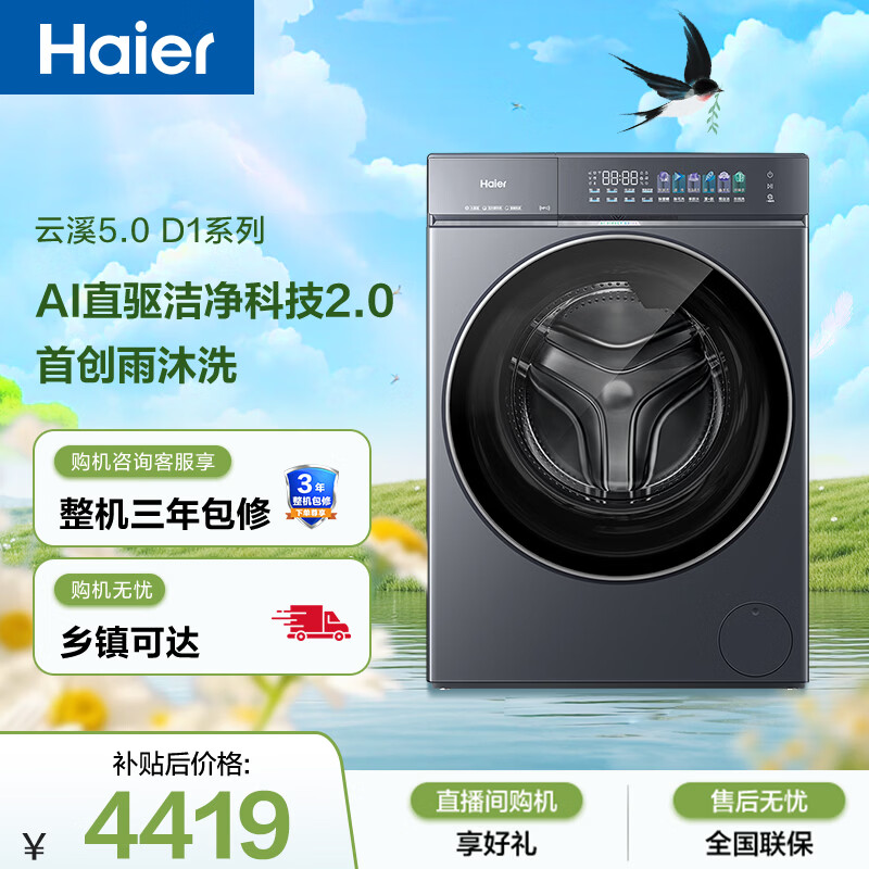 自营海尔(Haier)【价低LJQ直播9折】云溪5.0 AWE同款 滚筒洗衣机全自动单洗 10公斤超薄 京东自营独家 直驱7AD1