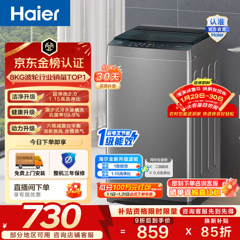 旗舰店海尔(Haier)波轮洗衣机8KG小型全自动 家用洗脱一体Z10D0 以旧换新一级能效 宿舍出租房单脱水家电换新补贴15% 8KG销冠丨金榜认证丨超净洗 波轮