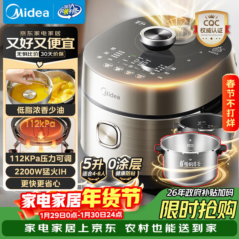 自营美的(Midea)低脂浓香 超高压112KPa电压力锅5L自动排气2200W猛火IH智能预约4-6人0涂层饭煲MY-S5892NF国家补贴