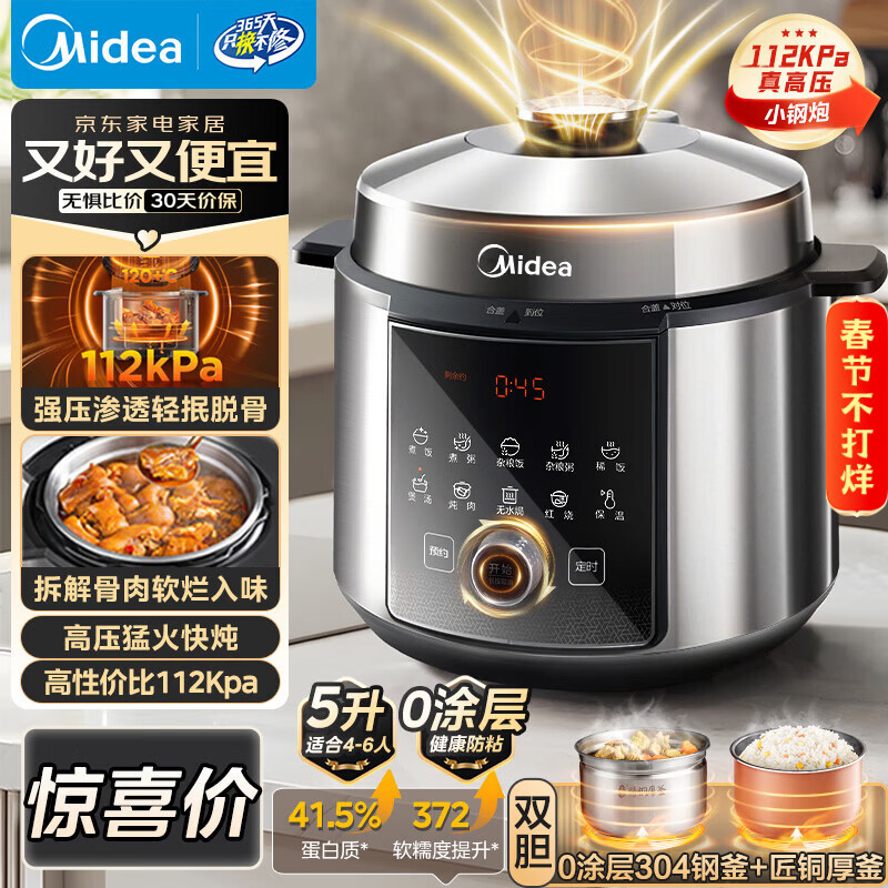 自营美的(Midea)超高压112KPa小钢炮电压力锅5L双胆0涂层智能预约家用煲汤煮饭电饭煲4-6人MY-E5830G