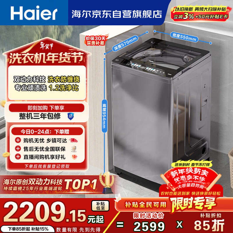 旗舰店海尔(Haier)波轮洗衣机全自动懒人家用 12公斤大容量 直驱变频 一级能效 家电换新补贴 BZ20D1
