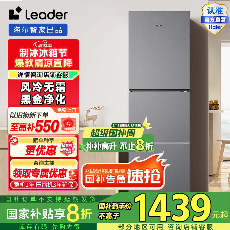 旗舰店统帅(Leader)海尔智家251升三门多门家用电冰箱一级变频风冷无霜黑金净化深冷速冻保鲜-30℃电冰箱LC3-258WS9 黑色