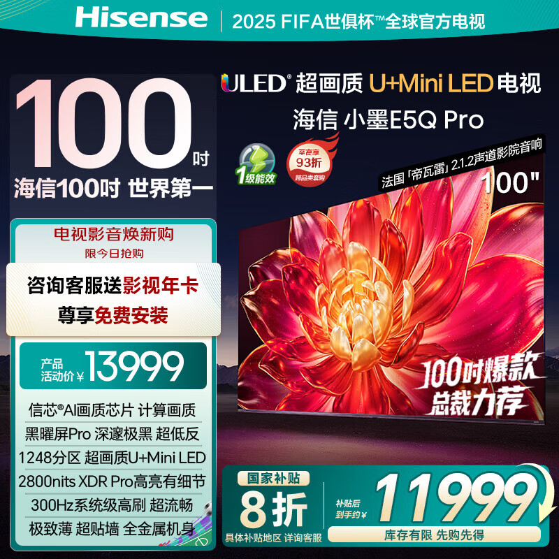 旗舰店海信电视小墨100E5Q-PRO 100吋画质U+Mini LED 黑曜屏Pro 信芯芯片 300Hz 100英寸