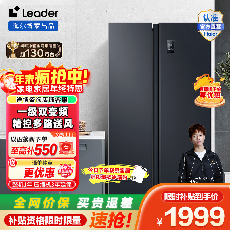 旗舰店统帅(Leader)海尔冰箱出品悦成系列538L对开门双门冰箱大容量一级能效风冷DEO净味BCD-538WGLSSEDBX国家补贴20% BCD-538WGLSSEDBX