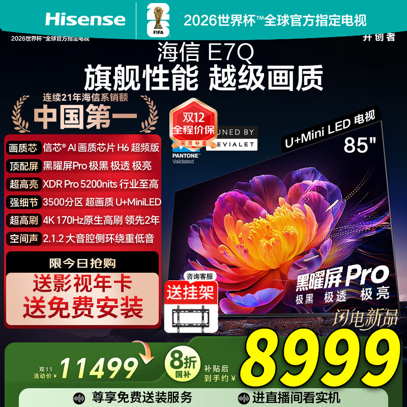 自营海信电视E7Q 85英寸【送装一体-伸缩挂架】信芯芯片H6超频版 黑曜屏Pro XDR5200nits 3500分区限时补贴