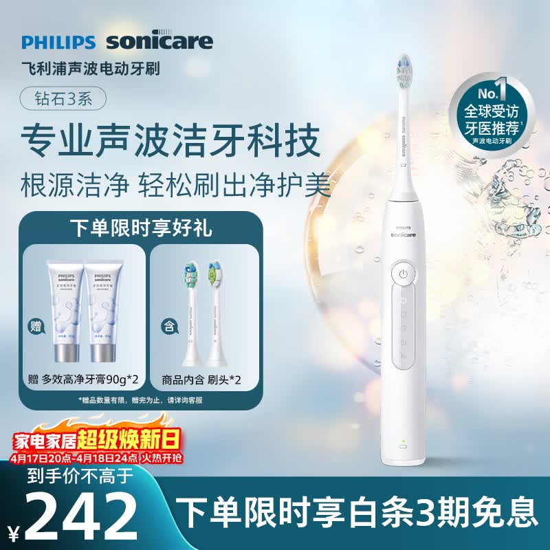 自营飞利浦(PHILIPS)声波电动牙刷钻石3系 5倍洁齿5种模式 刷头*2【亮白+洁净】生日礼物 送男生女友HX5181/01 白