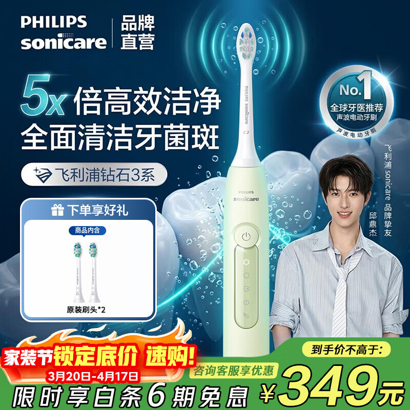 旗舰店飞利浦(PHILIPS)【邱鼎杰推荐】Sonicare 电动牙刷钻石3系6730升级款官方旗舰生日礼物送父母男生女生成人情侣套装 【品质款】HX5161/05抹茶绿