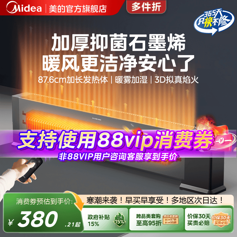 百亿补贴美的石墨烯踢脚线取暖器家用节能省电暖气卧室大面积速热暖风机