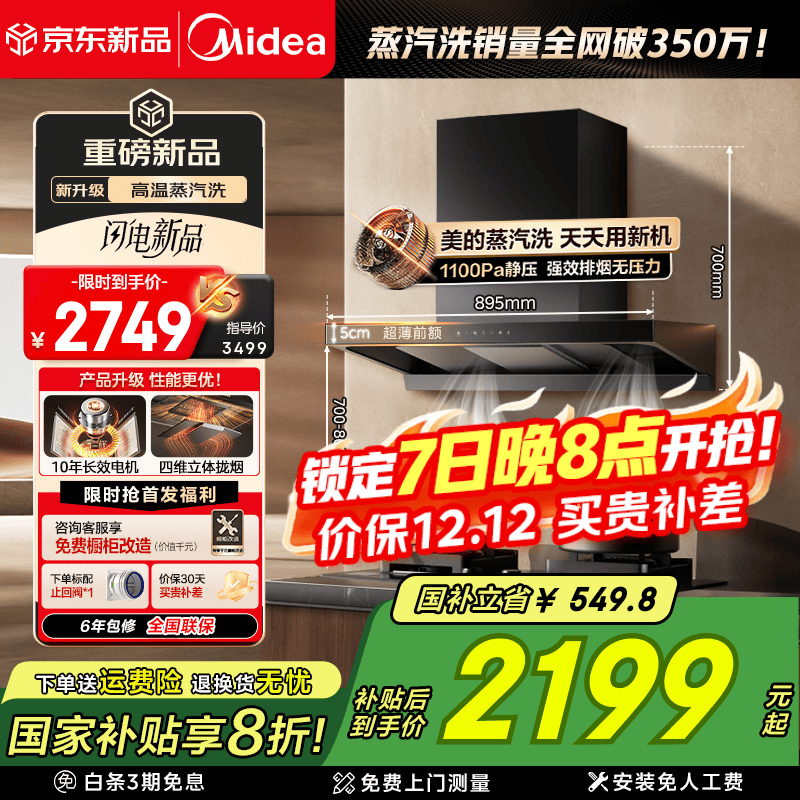 旗舰店[顶侧一体]美的蒸汽洗AK7PRO油烟机家用厨房大吸力AK5PRO官方旗舰