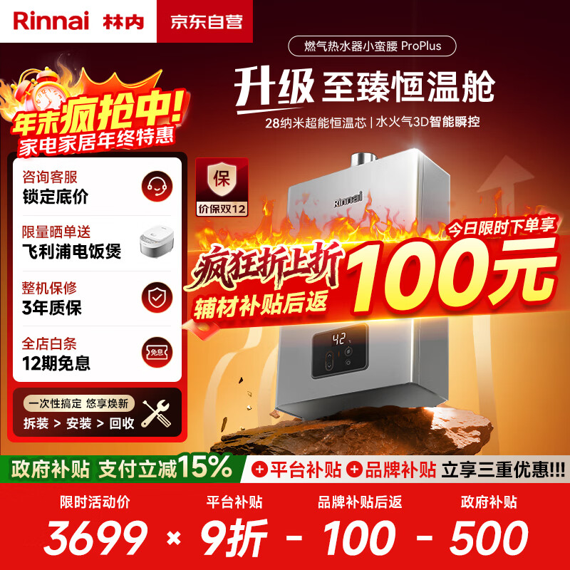 自营林内(Rinnai)【小蛮腰Pro plus】16升极光灰燃气热水器【家电国家补贴15%】 超能恒温芯 16GD33(JSQ31-GD33)