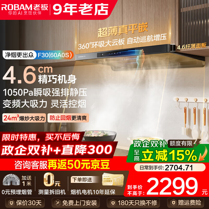 旗舰店老板抽油烟机【升级款】F30欧式超薄顶吸抽吸排油烟机24风量家用大吸力 60A0S【单烟机】