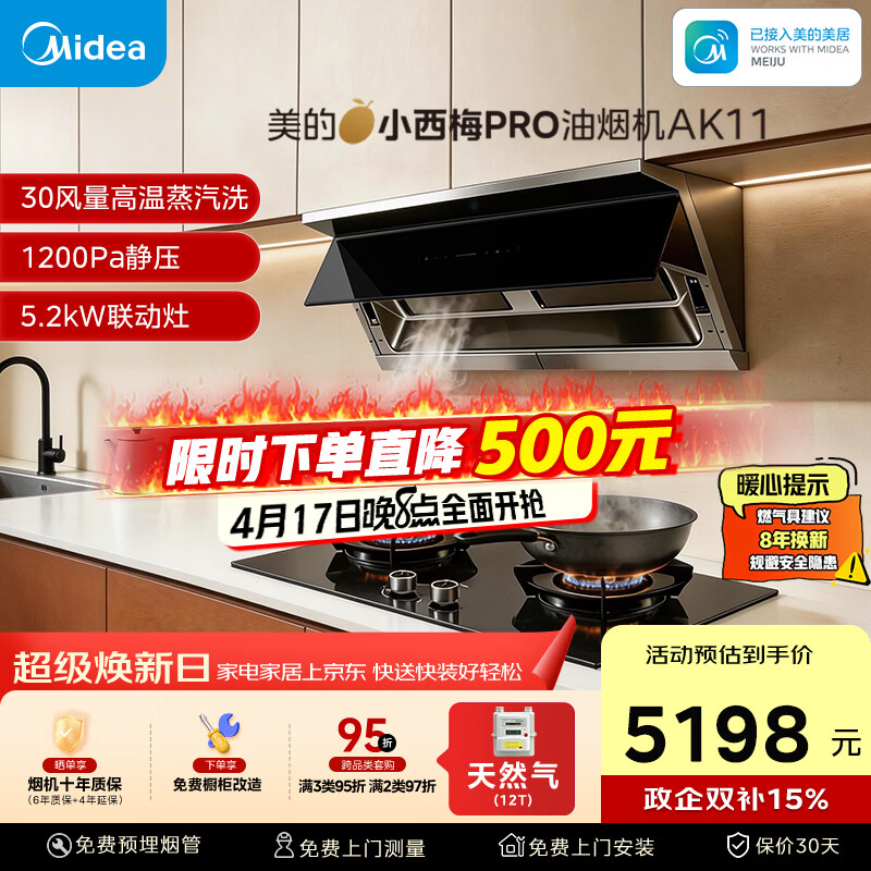 自营美的(Midea)【小西梅 PRO】油烟机自动蒸汽洗 30大风量顶侧一体 MAX双风道燃气灶具吸排油烟机AK11+Q529L-M