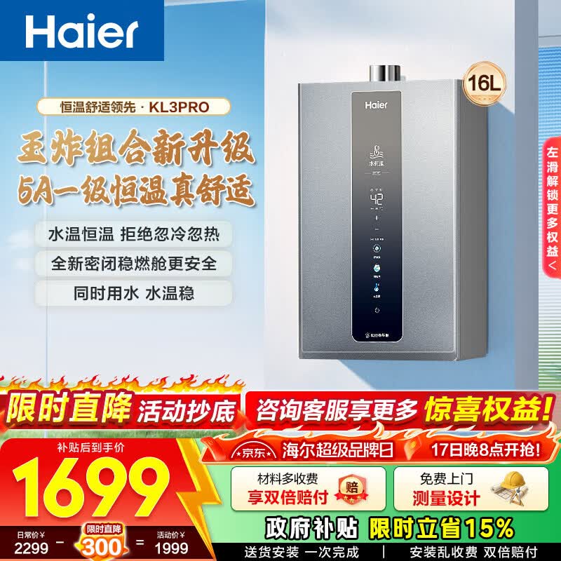 旗舰店海尔(Haier)燃气热水器【KL3pro】16升家用 天然气 水伺服恒温 五段微火 下置风机 密闭稳燃舱 16L 【KL3pro】同价位段性价比之王