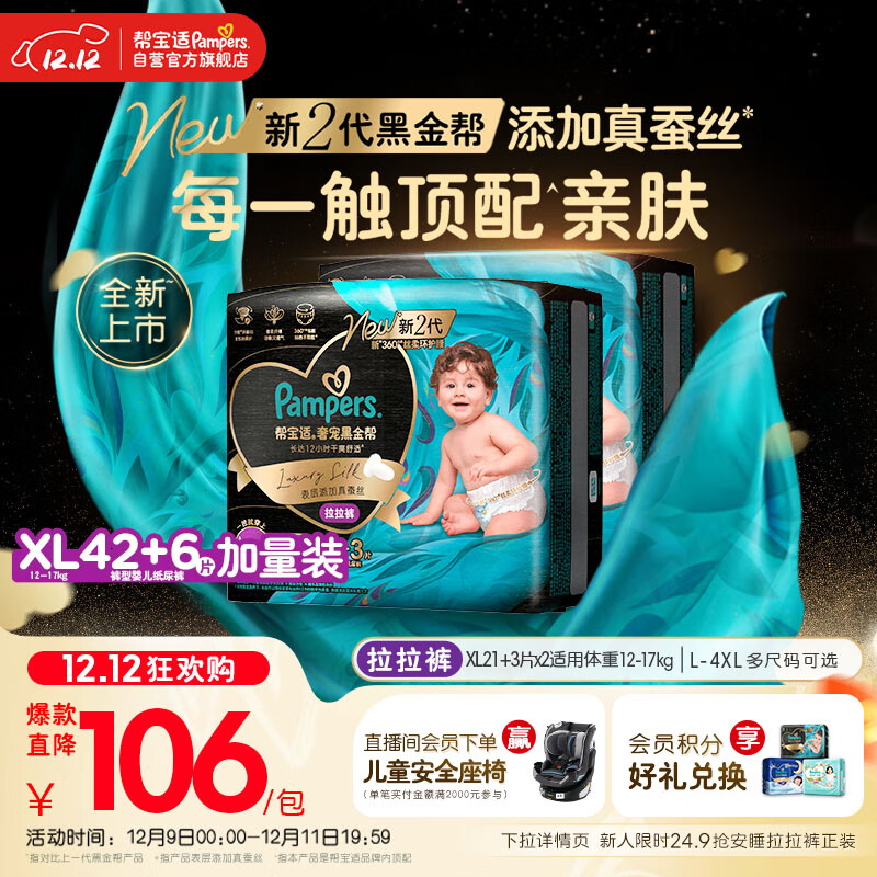 自营帮宝适透气顶配黑金帮婴儿拉拉裤尿不湿尿片尿布添加真蚕丝XL42+6