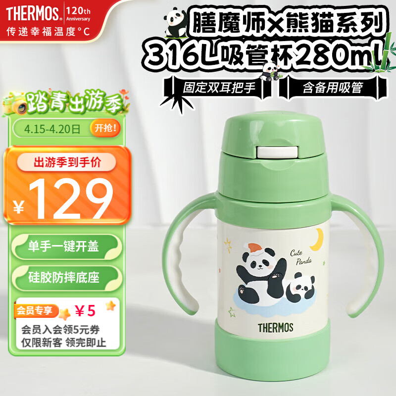 旗舰店膳魔师儿童保温杯带把手婴儿水杯316L宝宝吸管杯幼儿园学生水杯TCKK 熊猫 竹叶青280ml