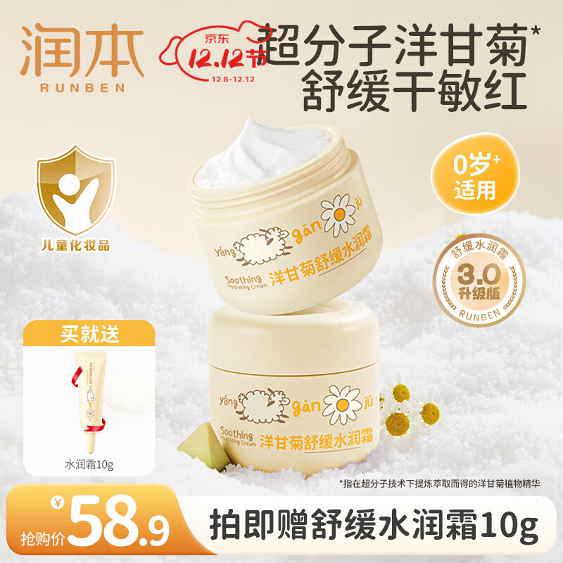 旗舰店润本(RUNBEN)儿童面霜宝宝霜滋润保湿秋冬季防皴补水新生婴儿擦脸霜护肤润肤乳 舒缓水润霜 50g 2瓶 【3.0升级版】