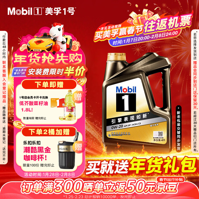 自营美孚(Mobil)金美孚全合成汽机油经典表现 曜石黑金系列 0W-20SP级4L 新老包装