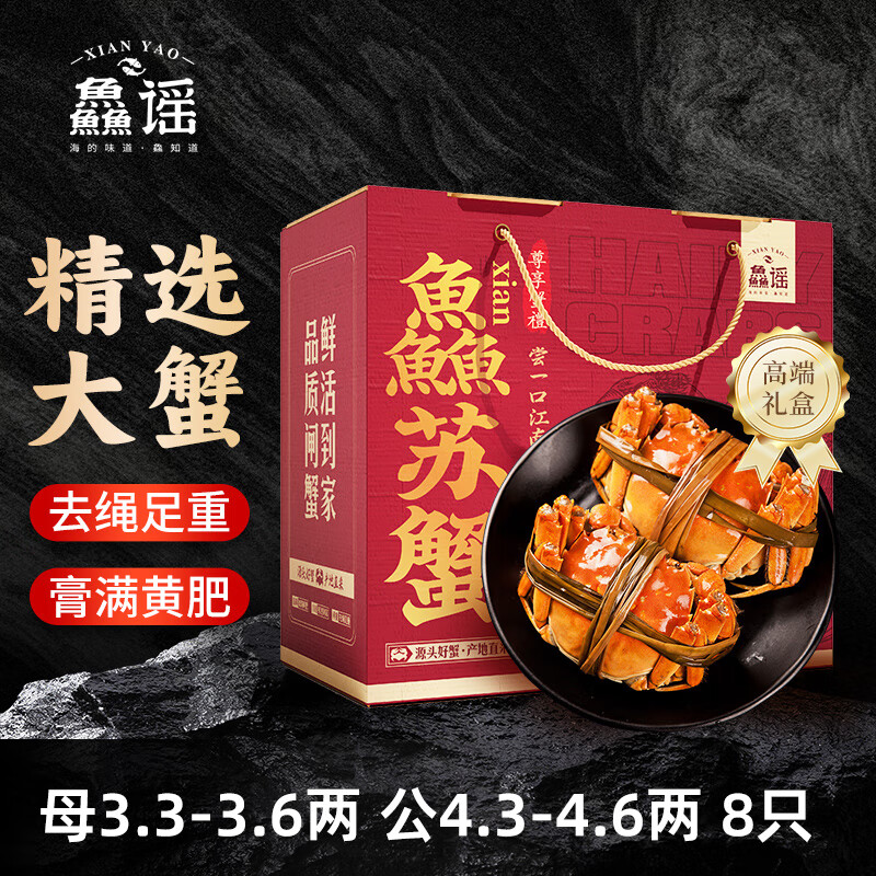 自营【活蟹】鱻谣 大闸蟹 公4.3-4.6两母3.3-3.6两 4对8只去绳足重 鲜活螃蟹现货 海鲜礼盒