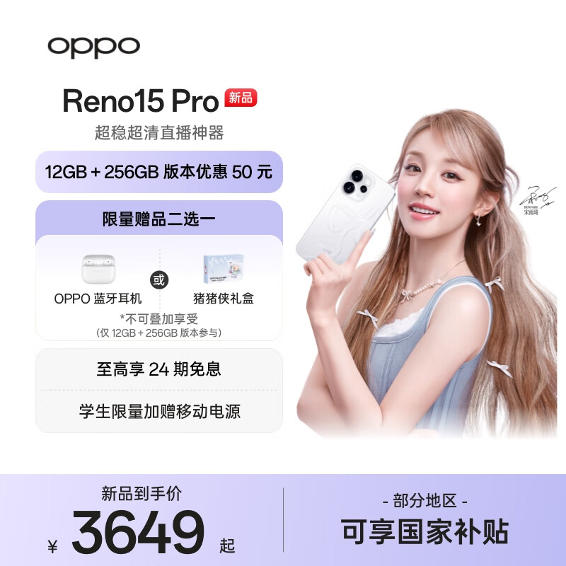 旗舰店OPPO Reno15 Pro 直播超稳 2亿超清影像 超出圈实况 5G智能 AI拍照手机 新品上市 星光蝴蝶结 12GB+256GB