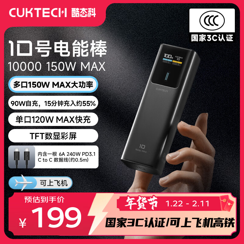自营CUKTECH酷态科【3C认证可上飞机】10号超级电能棒电芯10000毫安时充电宝120W多口150W快充支持笔记本/小米