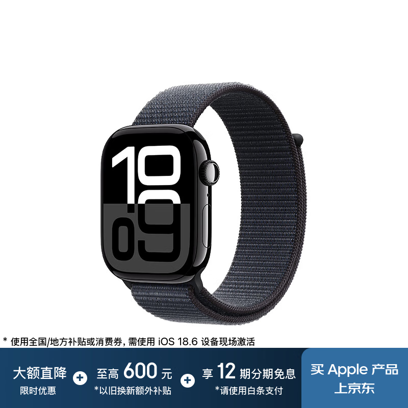 自营Apple Watch Series 10 智能手表46毫米亮黑色铝金属表壳黑色运动型表带M/L【GPS款】联通补贴