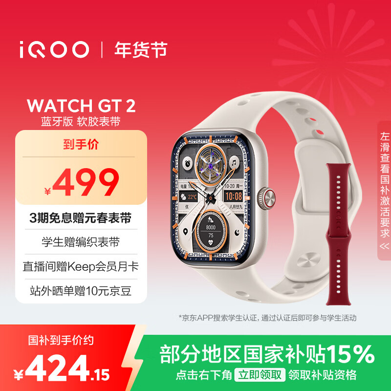 自营vivo iQOO WATCH GT 2 蓝牙版 软胶表带 星芒白 2.07英寸超亮全景屏 电竞模式2.0 智能手表