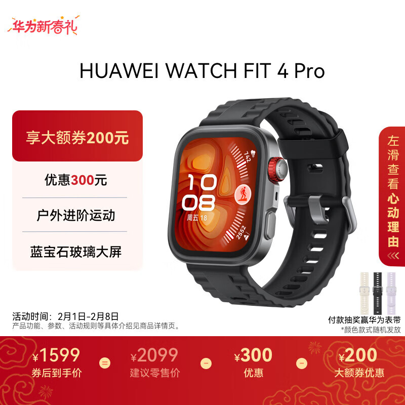 自营HUAWEI WATCH FIT 4 Pro曜石黑氟橡胶表带运动智能手表钛金属蓝宝石玻璃大屏长续航fit4pro