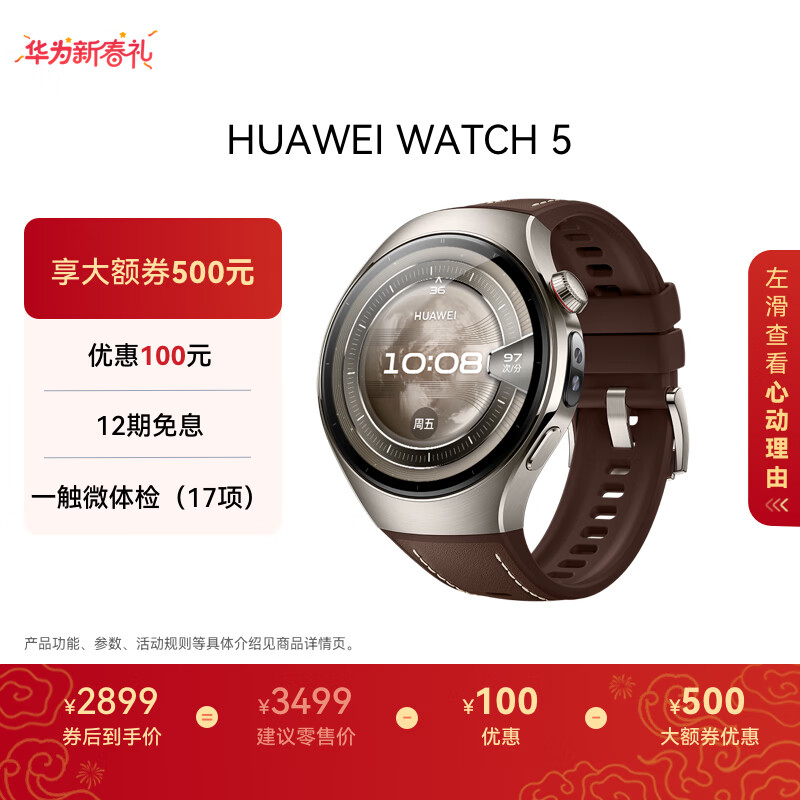 自营HUAWEI WATCH 5 46mm高端款航天级钛合金表壳木星棕素皮复合表带首创X-TAP智感窗eSIM通信华为智能手表