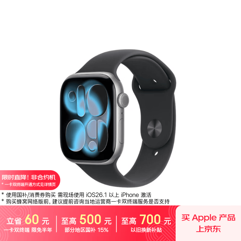 自营Apple/苹果WatchS11智能手表GPS款46毫米深空灰色铝金属表壳黑色运动型表带M/L-联通补贴