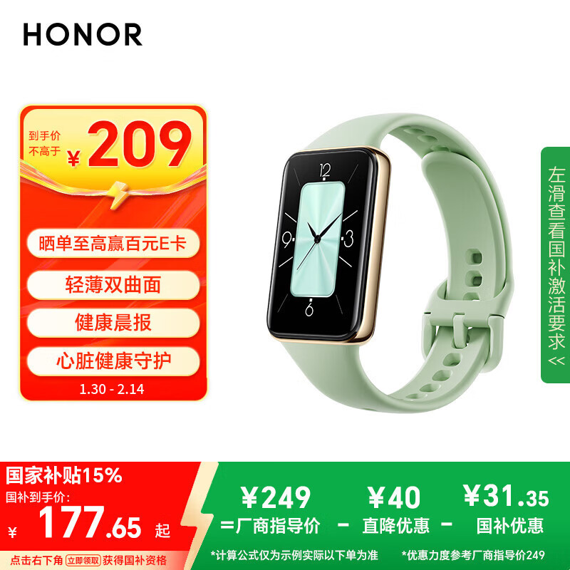 自营荣耀(HONOR)手环10 标准版【国家补贴】薄荷绿 智能运动手环 轻薄双曲面 健康晨报 心脏健康守护监测送女友