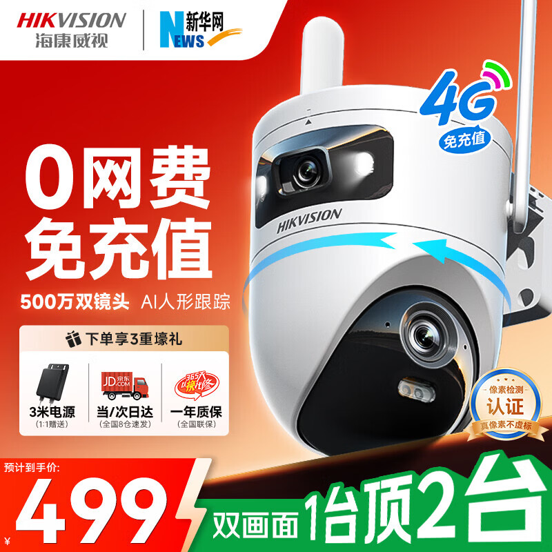 自营海康威视(HIKVISION)4g监控摄像头室外家用终身免流量500万双摄360度无死角带夜视全景高清监控器 农村户外防水q4