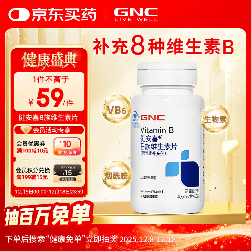 自营健安喜(GNC)B族维生素片60片复合VB含b1b2b6b12叶酸泛酸烟酰胺生物素花少同款