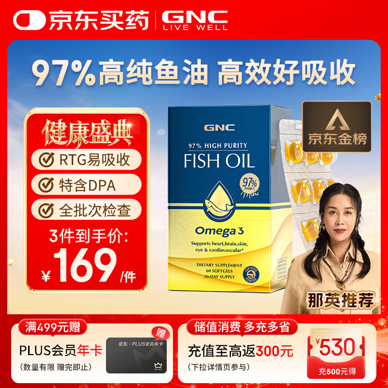 自营GNC健安喜97%高纯度epa深海鱼油omega3非鱼肝油鱼油成年人dha60粒/盒
