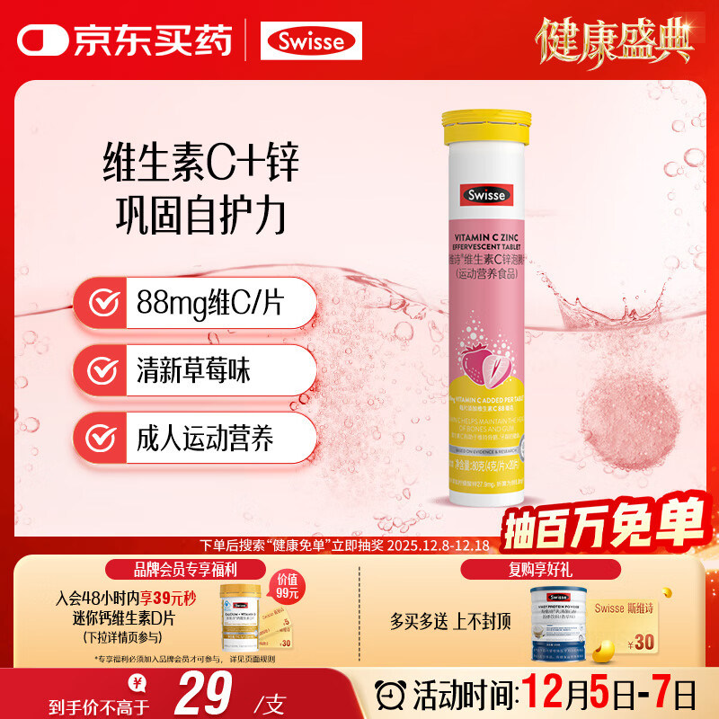 自营Swisse斯维诗 维生素C+锌泡腾片 巩固自护力 成人运动营养 草莓味 20片