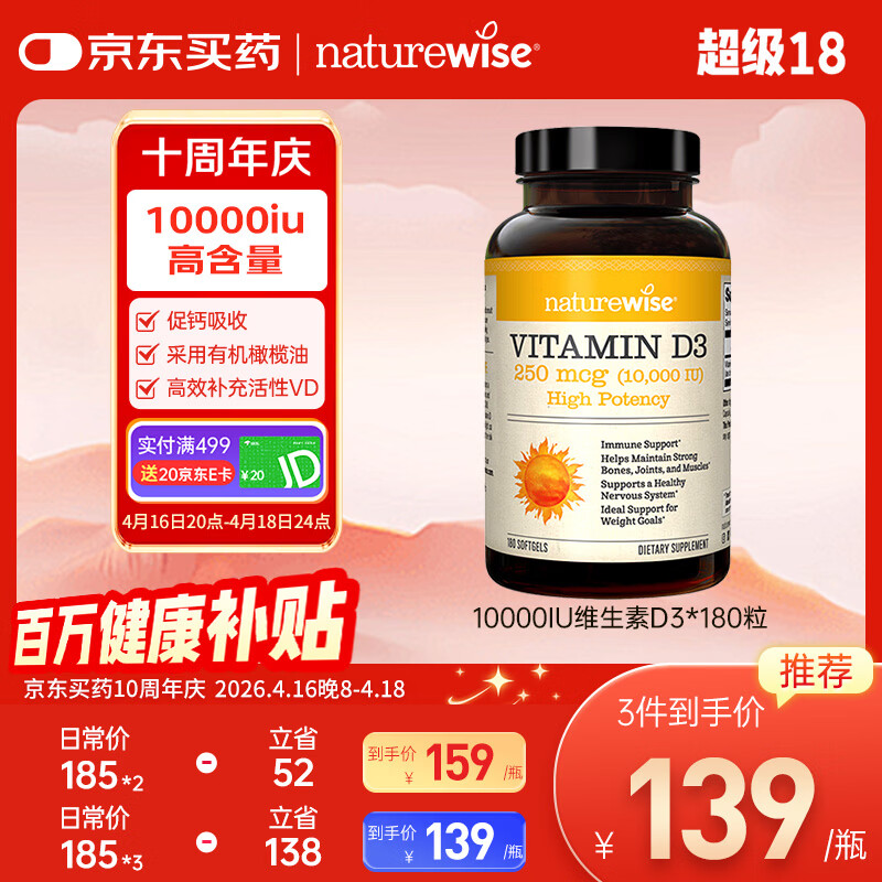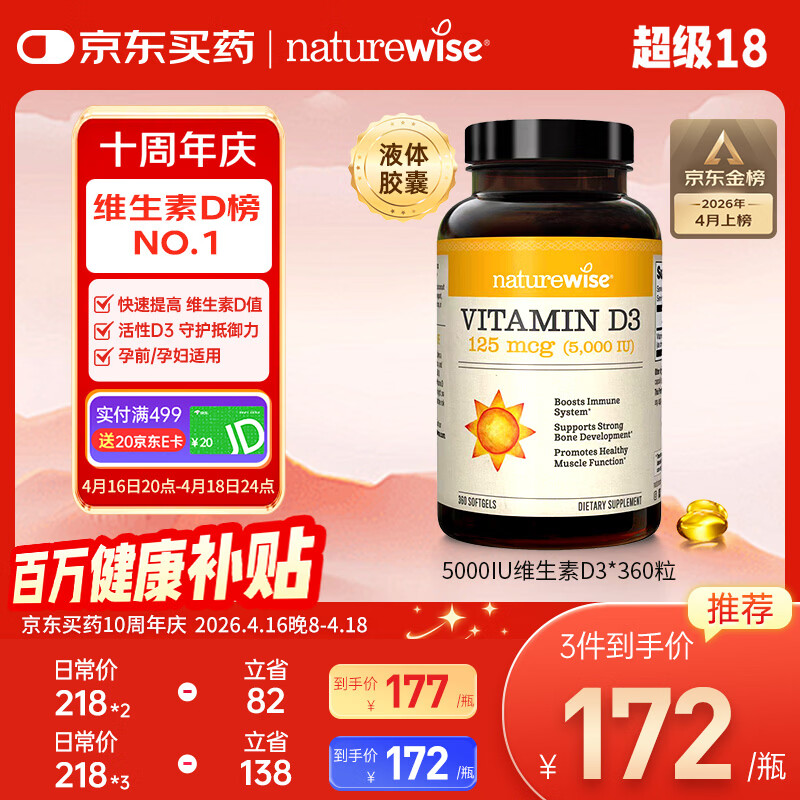 自营自然薇萃(naturewise)阳光瓶维生素D3软胶囊10000IU高含量180粒/瓶 活性25羟基维生素D3