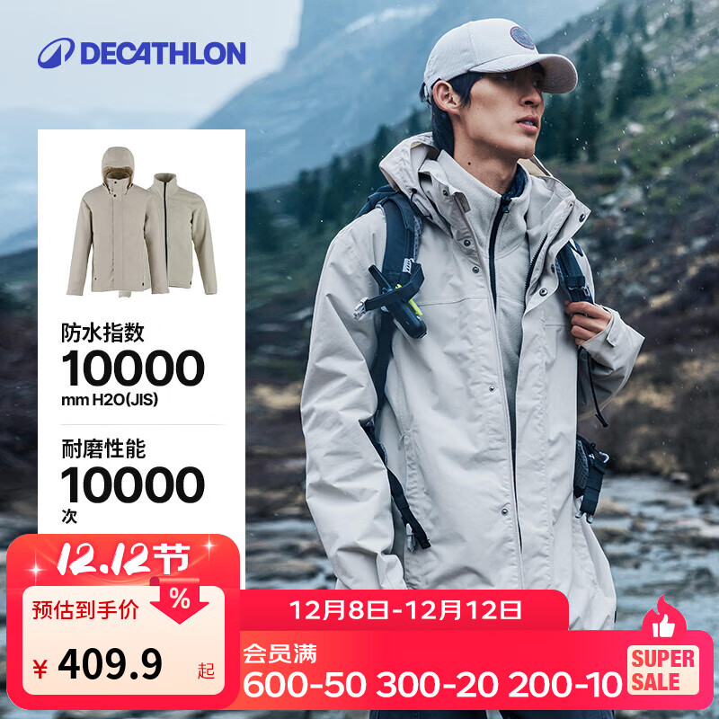 旗舰店迪卡侬(DECATHLON)冲锋衣男三合一男女夹克防风防水夹克男保暖可拆卸内胆抓绒衣外套 男款 月白色 亚洲版型 M