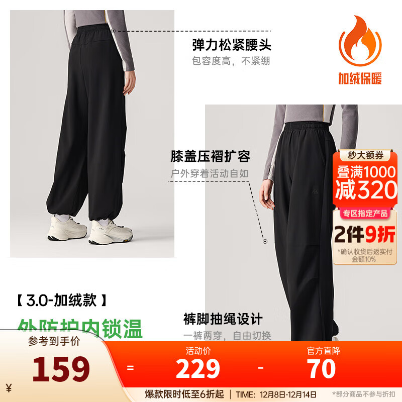 旗舰店安踏户外伞兵裤丨大地之壳防风防泼水宽松软壳裤女裤冬季阔腿运动长裤 【大地之壳3.0-加绒款】基础黑-4 [防护锁温] M (女165)