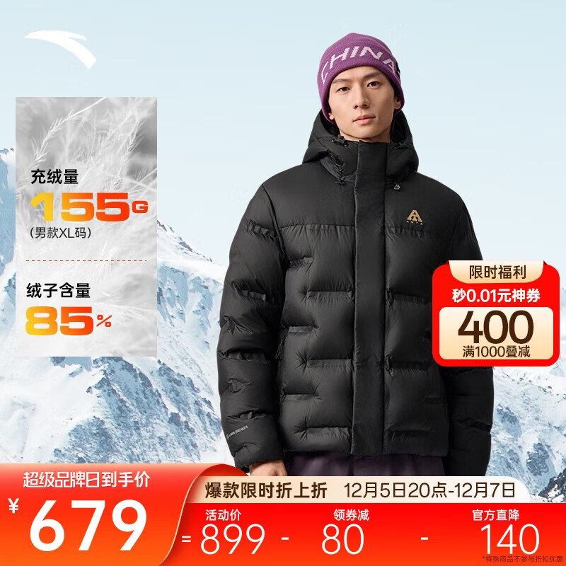 自营安踏面包羽绒服丨六度芯户外鹅绒管道羽绒服男士冬季连帽保暖外套