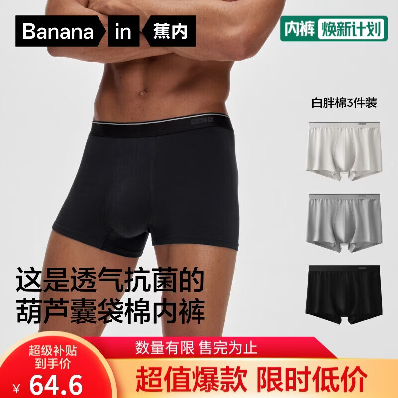 自营蕉内(Bananain)银皮330S纯棉男士内裤40支白胖棉10A抗菌男生夏季透气平角裤3件装