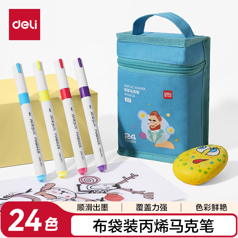 自营得力(deli)24色丙烯马克笔水彩笔易握圆杆学生儿童涂色手绘DIY荧光记号笔袋装HM330-24水彩笔美育