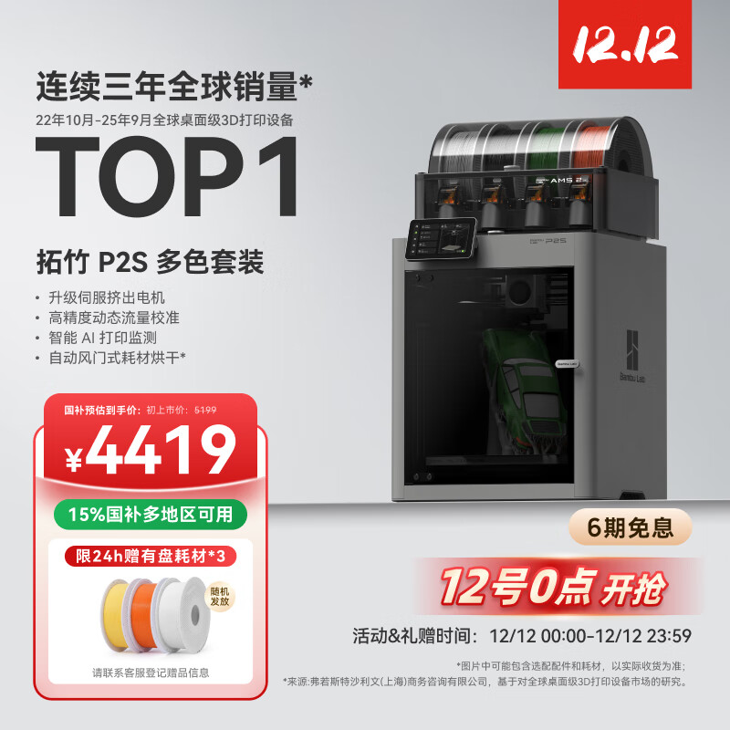 自营拓竹P2SC 3D打印机器大尺寸FDM家用桌面立体打印高精度高速AI监测烘干P1S升级