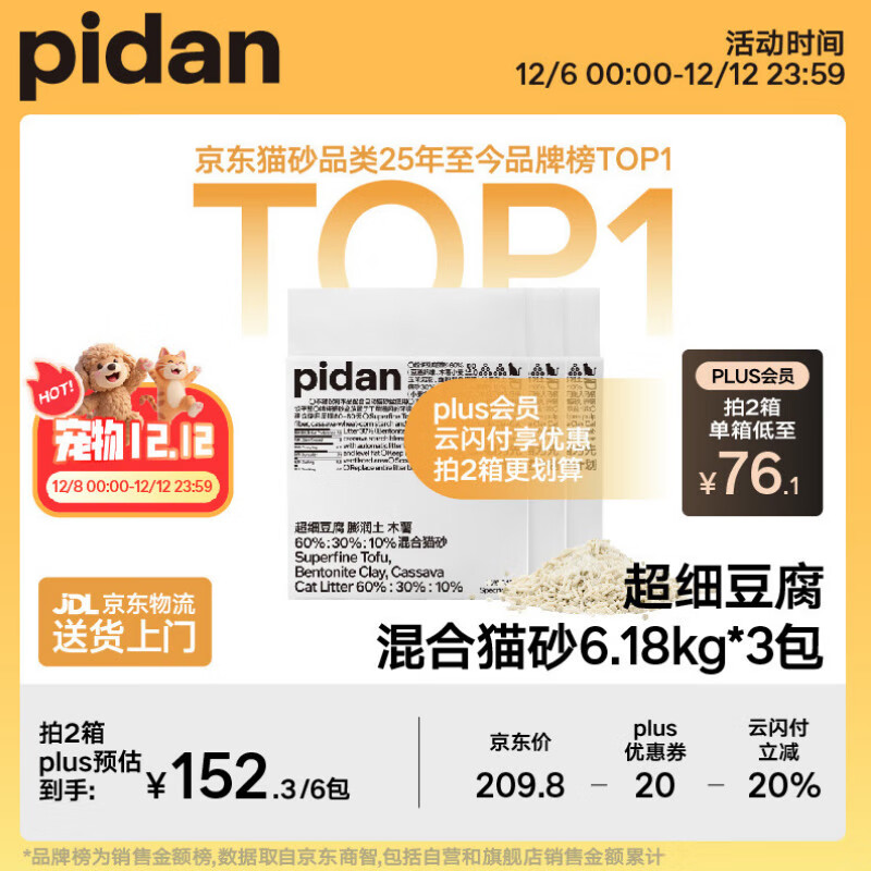 自营pidan猫砂 超细豆腐膨润土混合猫砂6.18KG*3包 整箱装皮蛋猫砂自营