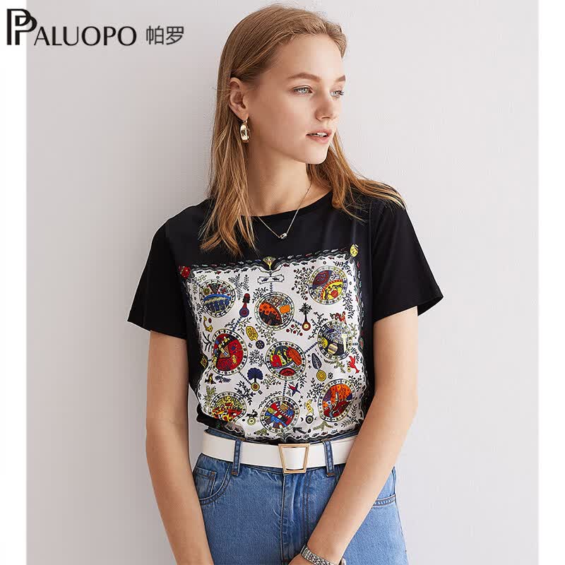 旗舰店帕罗(PALUOPO)短袖印花短袖t恤女夏桑蚕丝透气正肩休闲百搭设计感小众t恤上衣 缤纷绘画 M (160/84A)