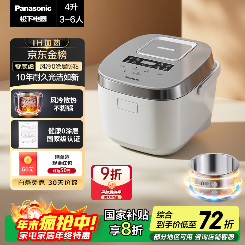 自营松下(Panasonic)【国家补贴20%】Xtra零零煲电饭煲0涂层IH家用无涂层电饭锅4-5人不锈钢胆4升一级能效SR-HFS153C-W