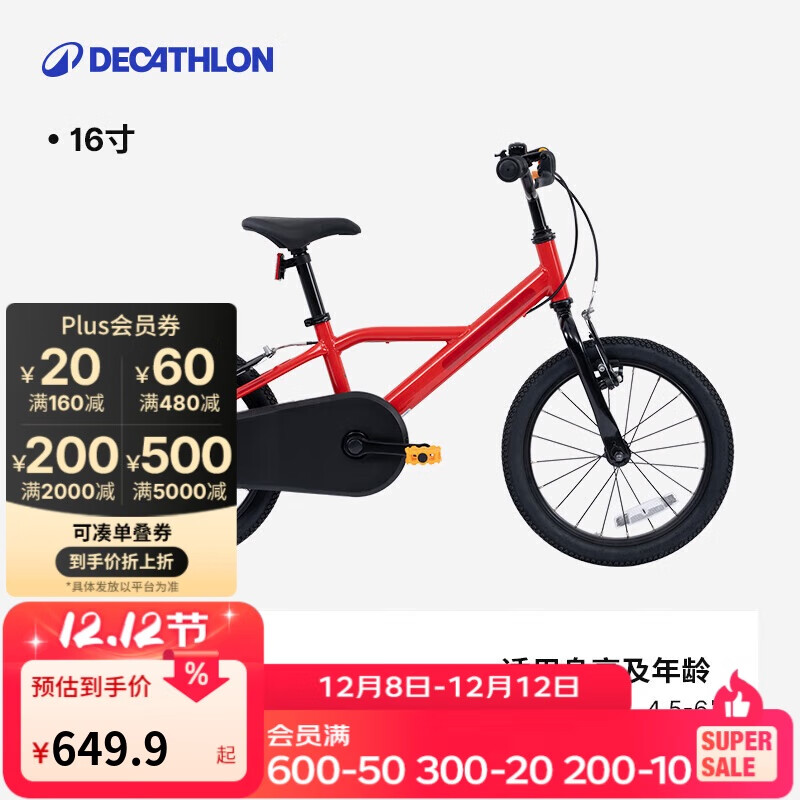 自营迪卡侬儿童自行车16寸4-6岁男孩女孩单车平衡车-5145685