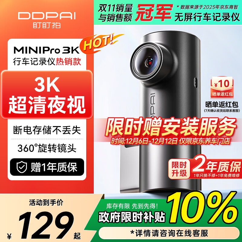 自营盯盯拍行车记录仪MINIPro 3K超清夜视 WDR宽动态F1.55光圈 360度旋转
