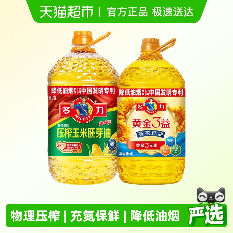 多力黄金3益葵油4L+经典玉米油5L物理压榨降低油烟食用油