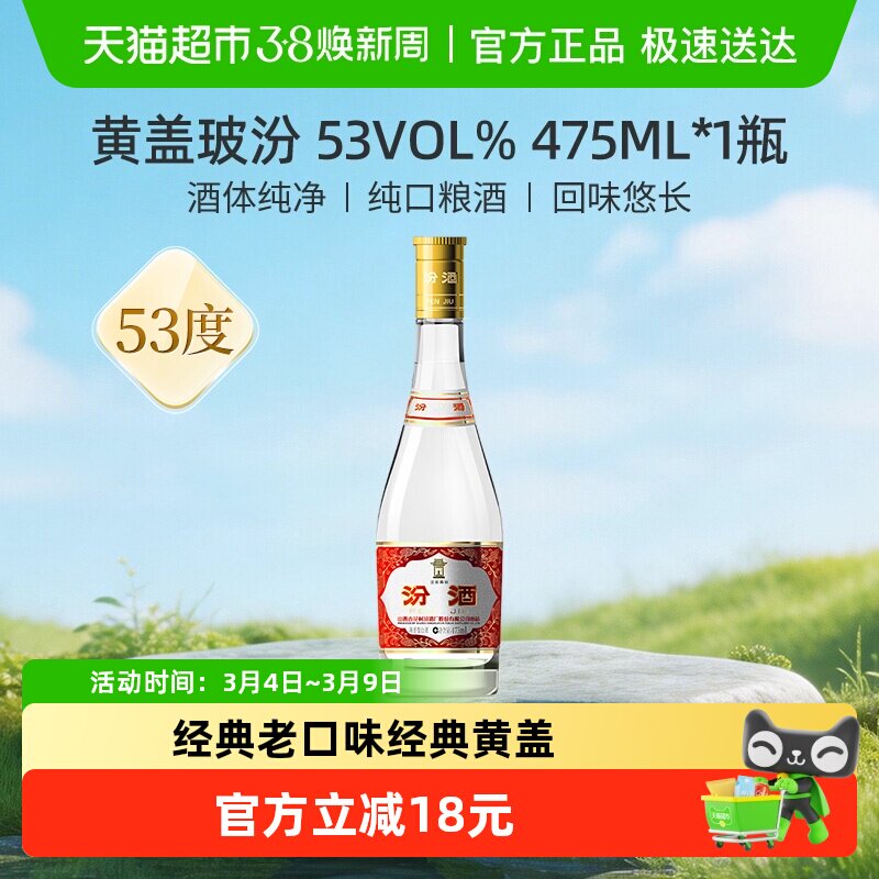 汾酒山西杏花村53度黄盖高度玻汾475ml*1瓶清香型白酒口粮酒